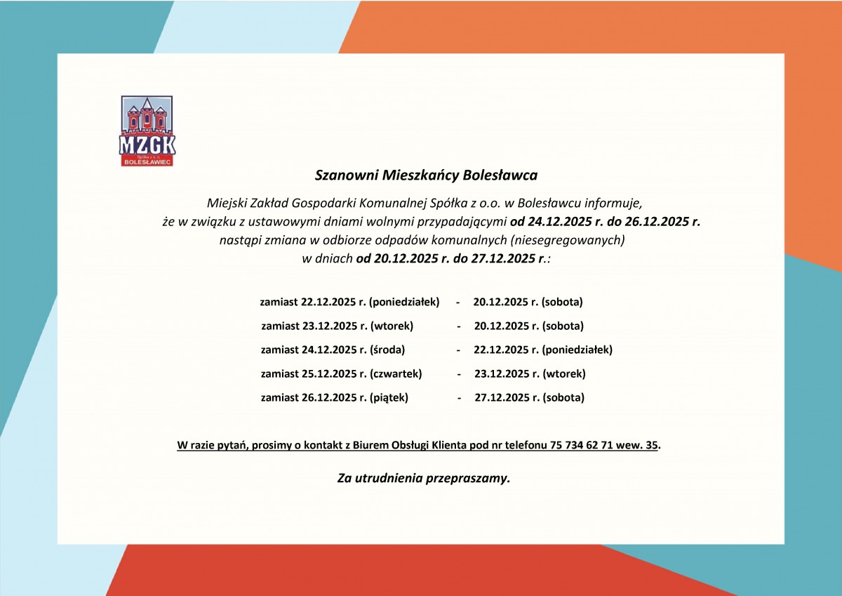Miejski Zakład Gospodarki Komunalnej Spółka z o.o. w Bolesławcu informuje, że w związku z ustawowymi dniami wolnymi przypadającym od 24.12.2025 r. do 26.12.2025 r. nastąpi zmiana w odbiorze odpadów komunalnych (niesegregowanych) w dniach od 20.12.2025 r. do 27.12.2025 r.: